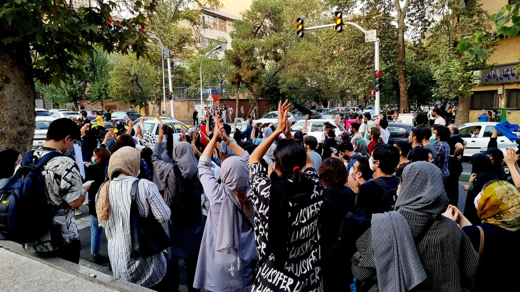 People participating in the Zan, Zendegi, Azadi protests in Iran in Tehran, September 2022. The protests were triggered after 22 year old Mahsa Amini was beaten to death by the Morality Police for ‘failing to wear the hijab properly.’ Hundreds of thousands took to the streets in outrage, with an estimated 20,000 arrested and 500 killed by security forces.