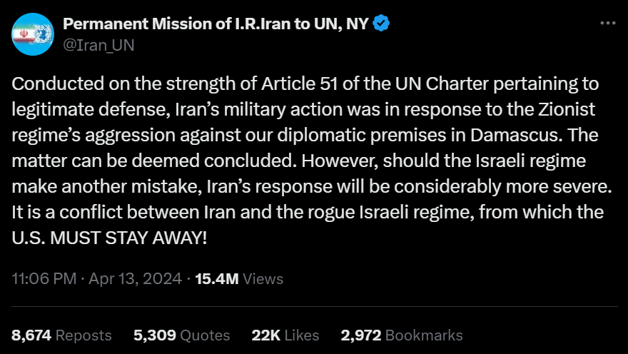 Before the attack, Tehran engaged in active back-channel communications with the US and it’s regional allies to reassure them that it did not seek to ignite a war: on April 11 Iran’s Foreign Minister Hossein Amirabdollahian signalled to the US, via Oman, that it did not seek to trigger a war. Amirabdollahian also stated that he gave US regional allies, identified as the Gulf monarchies in most reports, 72 hours’ prior notice of the attack. Once the strikes had concluded, the Iranian mission to the UN tweeted that “The matter can be deemed concluded.”